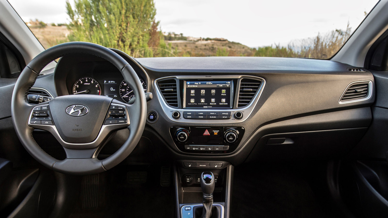 Về nội thất thì cảm giác đầu tiên khi bước vào bên trong Hyundai Accent đó là sự quen thuộc. Nội thất của Accent tiếp tục áp dụng triết lý HMI (Human Machine Interface) như người anh em Elantra hay Sonata và có một số thứ giống với cả Grand i10. Tuy nhiên, về trang bị nội thất và tiện nghi thì phải nói là Hyundai đã mang lên Accent rất nhiều: Trên vô-lăng xe được tích hợp nhiều nút bấm dành cho hệ thống thoại rảnh tay, điều khiển hệ thống thông tin giải trí, cruise control,.. Ngoài ra chiếc sedan hạng B này cũng có cản cảm biến gạt mưa tự động, cửa sổ trời, ngăn chứa đồ tích hợp làm mát, cổng sạc cho hàng ghế sau, hệ thống điều hoà tự động khử ion,..
